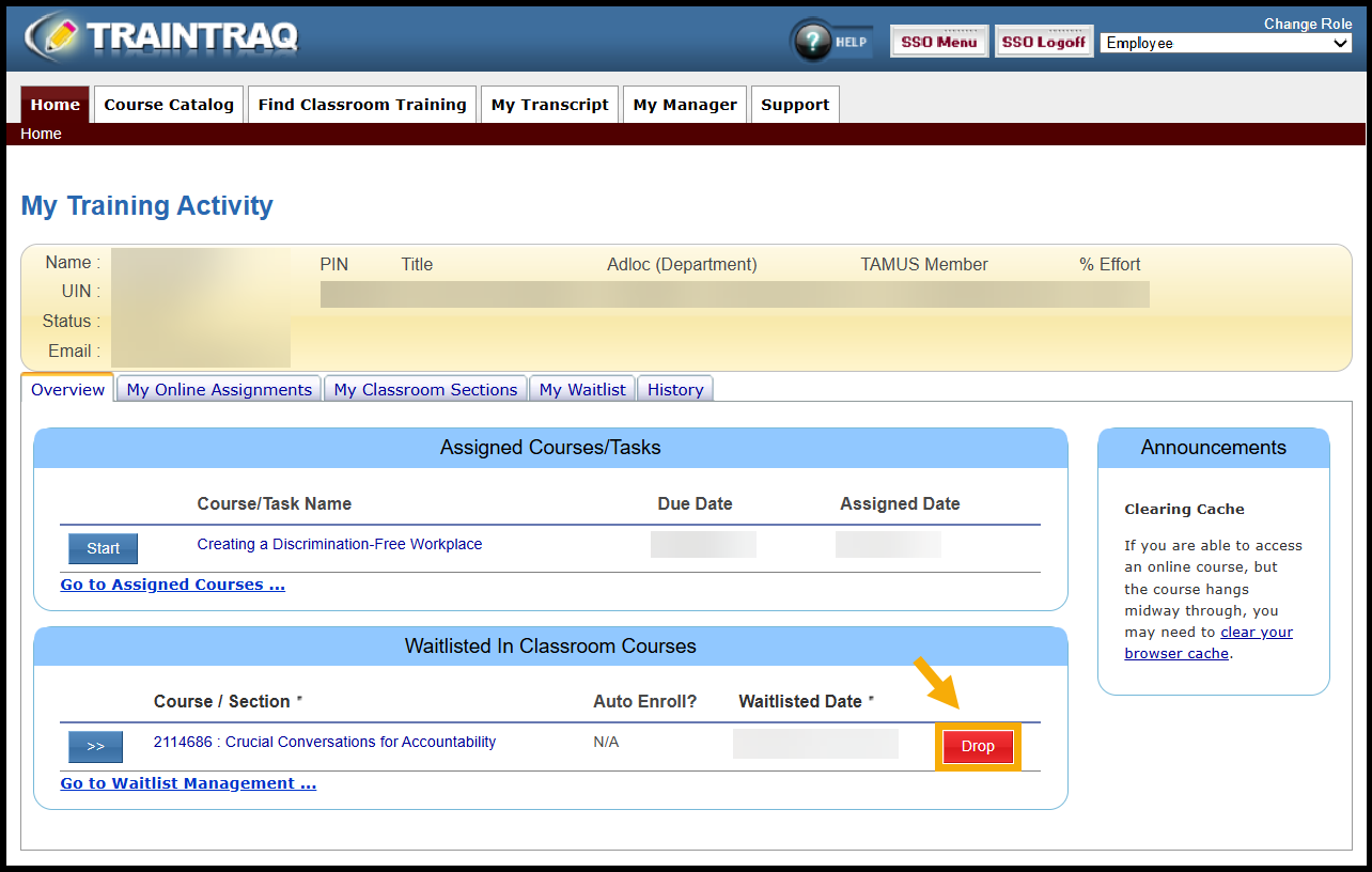 - A message displays at the top of the page to confirm that you have now been removed from the waitlist. Note: Refresh the page to see the course removed from the Waitlisted in Classroom Courses section.