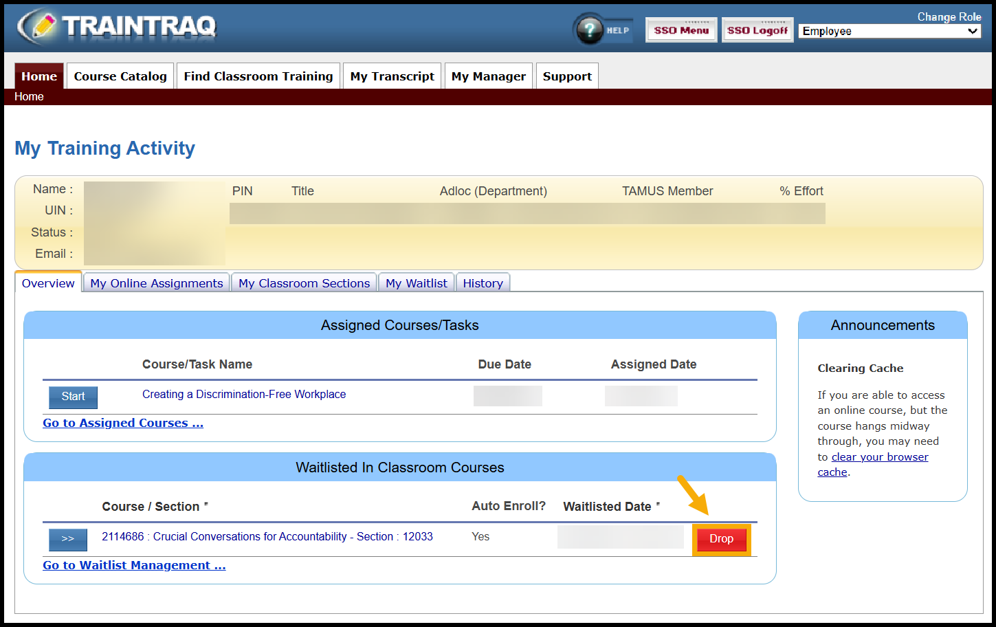 - A message displays at the top of the page to confirm that the training has been dropped. Note: You can refresh your page to see the section is removed from the Waitlisted In Classroom Courses section.