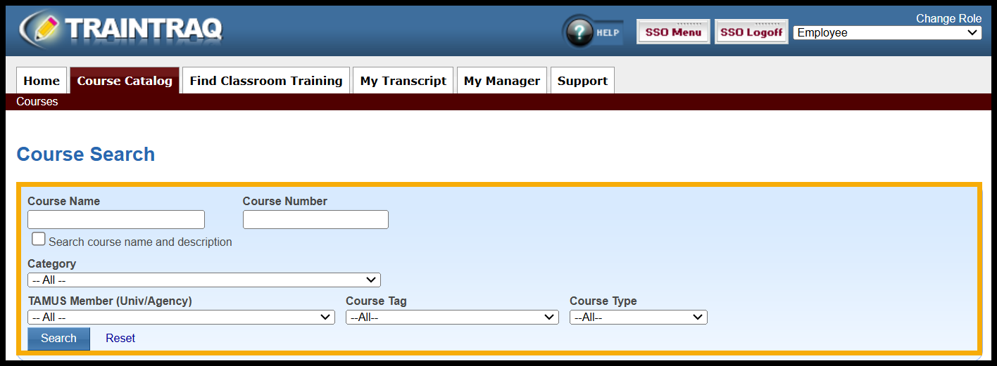 - TAMUS Member (Univ/Agency): Select a Texas A&M University System member to search for courses owned by that A&M System university or agency. Use “All” to search for all courses in the catalog. Use “S – Texas A&M System Offices” to search for courses specifically intended for System wide use, such as System-required training.