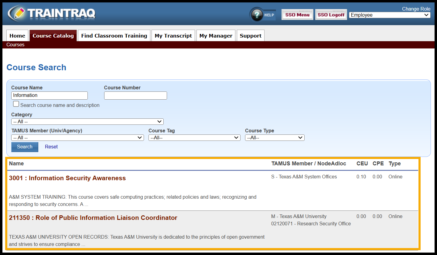 - Press Enter or select Search to display the results. The course listing displays the course number, name, description, owning TAMUS Member/NodeAdloc (Workstation), CEU credit, CPE credit, and course type for each course displayed.