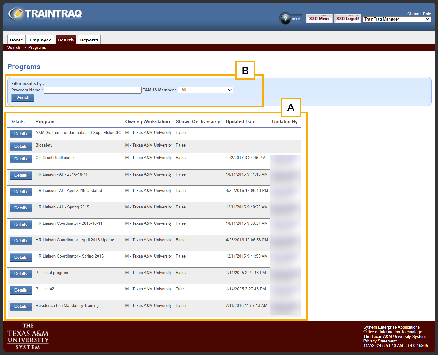 - Complete one or more of the fields in the “Filter results by:” section at the top of the Programs page. You can search by Program Name and/or Workstation. When finished, click the Search button. The list of programs displayed at the bottom of the Programs page updates to reflect the search criteria entered.