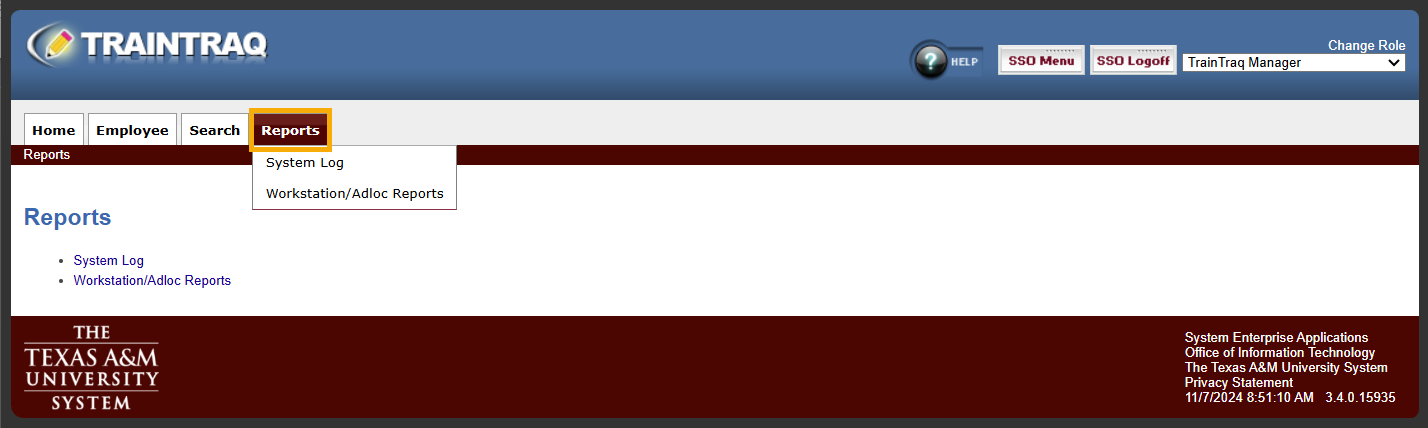 The Reports page allows you to access the two major report types in TrainTraq.