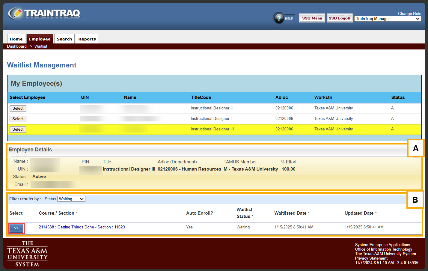 - A list of courses the selected employee is waitlisted for. You can learn more about each course by clicking on the “>>” button to the left of the course number.