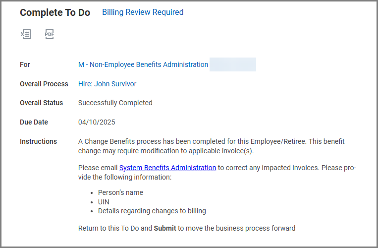 - Return to the To Do: Enter Survivor Data for Employee and select Submit.