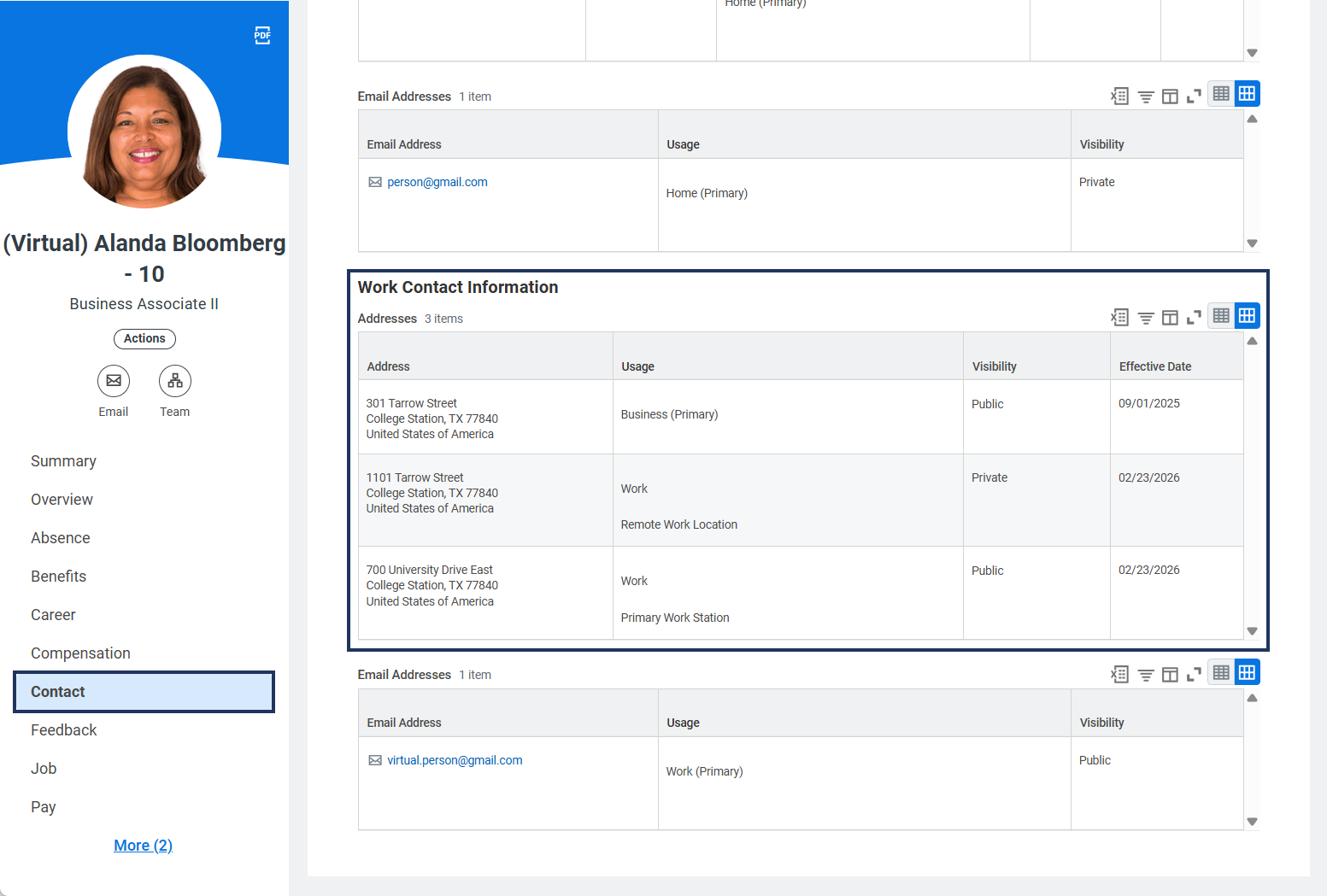The Business Address is the main address for the Employee’s Texas A&M University System member. This address is not editable and may not reflect the Employee’s actual work location.
