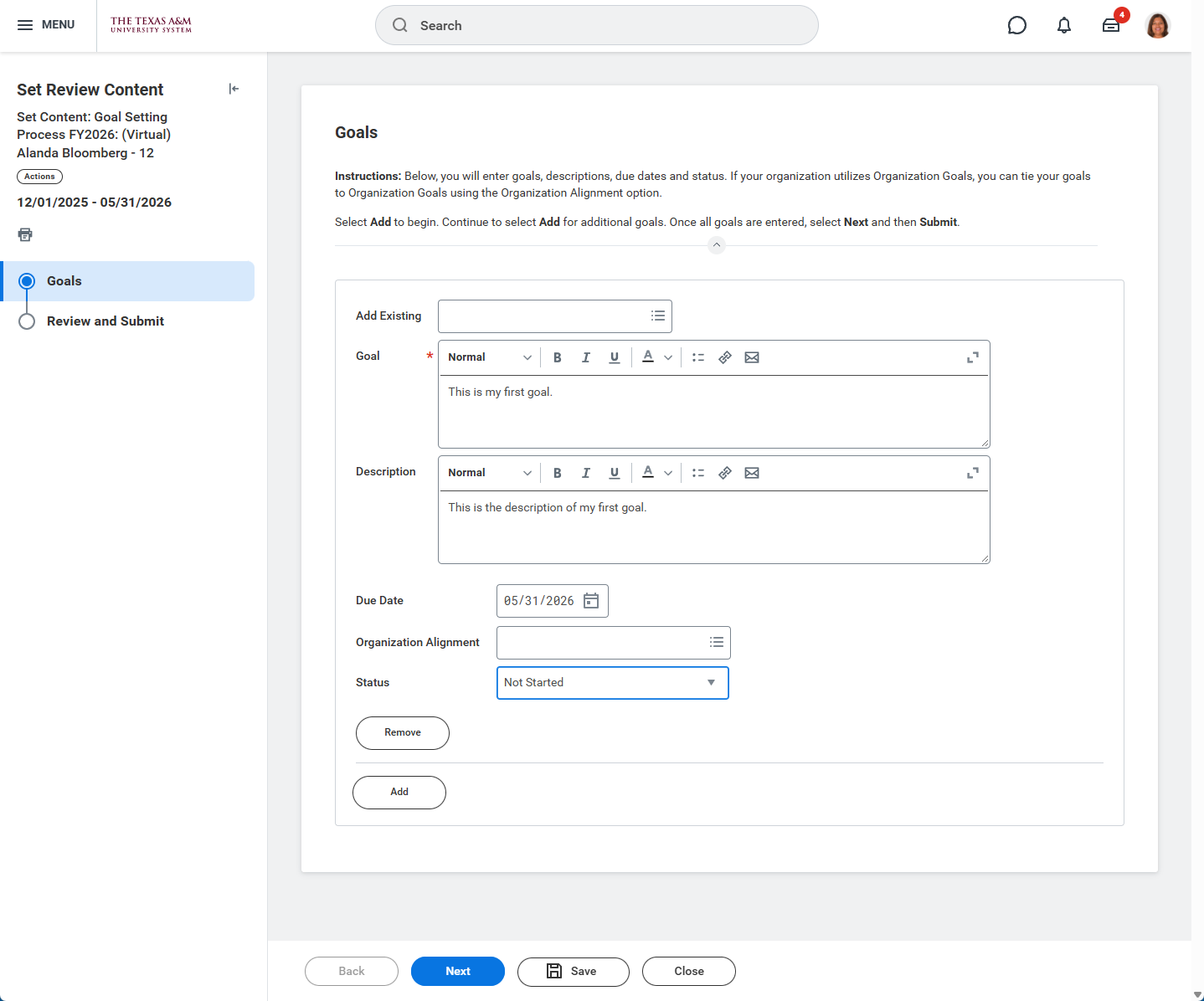 - Complete the following fields: Goal (required), Description, Due Date, Organizational Alignment and Status.