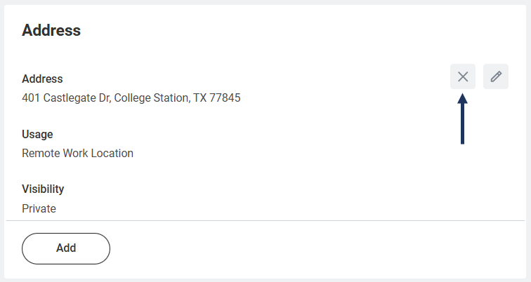 - On the Change My Work Contact Information page in the Address section, delete the Remote Work Location address by selecting the X icon.
