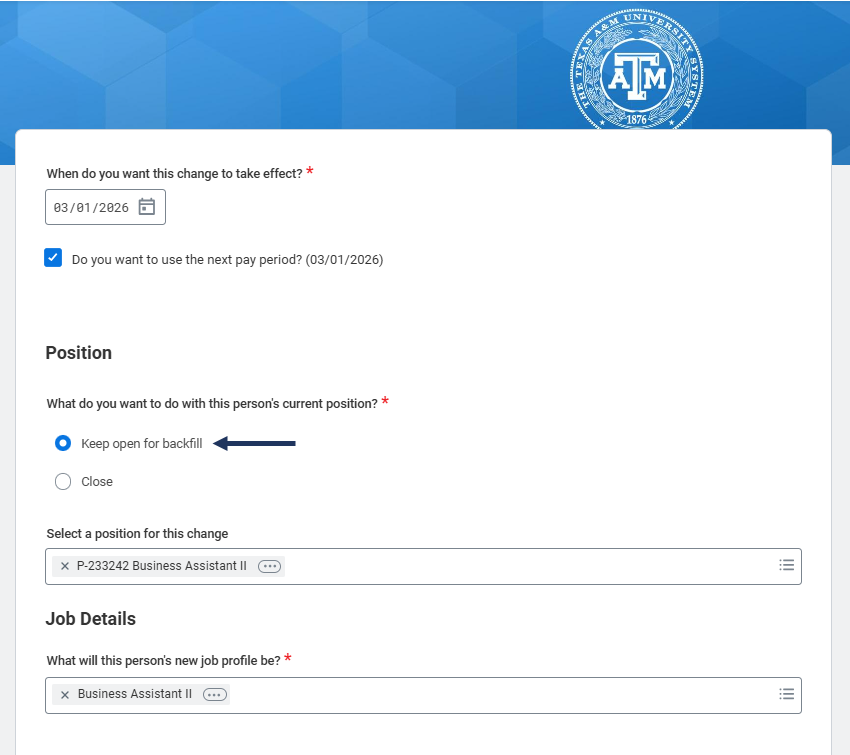 - After selecting a the new position, the question What do you want to do with this person’s current position? Select Keep open for backfill.