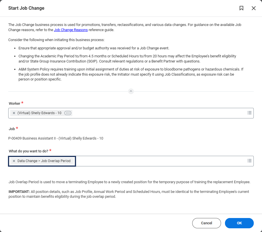You will now initiate the Start Job Change business process for the terminating Employee to move them into the temporary position you created for the Job Overlap period.