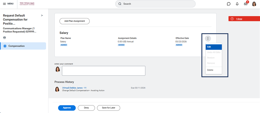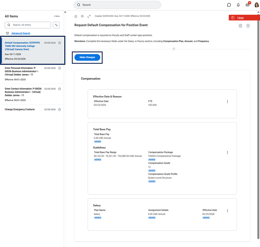 - The initiator will receive the To Do Update Position Restriction Default Compensation to update the vacated position’s default compensation, if needed.