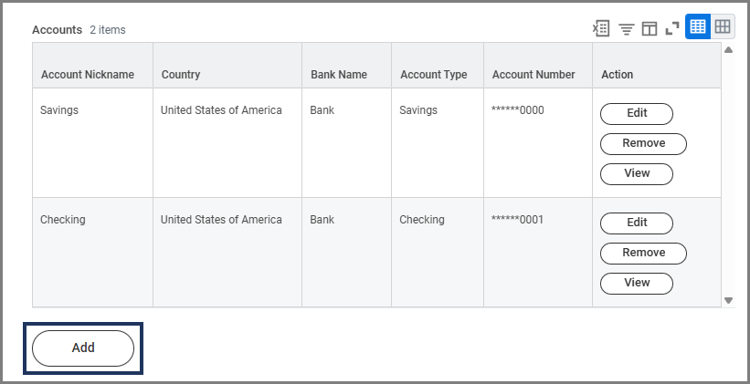 - Bank accounts you would like to have available as options for direct deposit must first be added in the Accounts section of your payment elections in Workday.