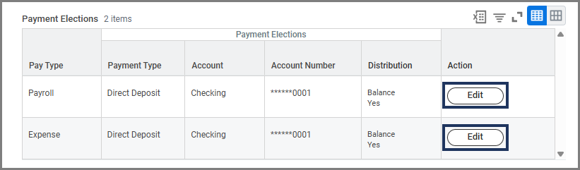 - In the Payment Elections section, select Edit for either Payroll or Expense.