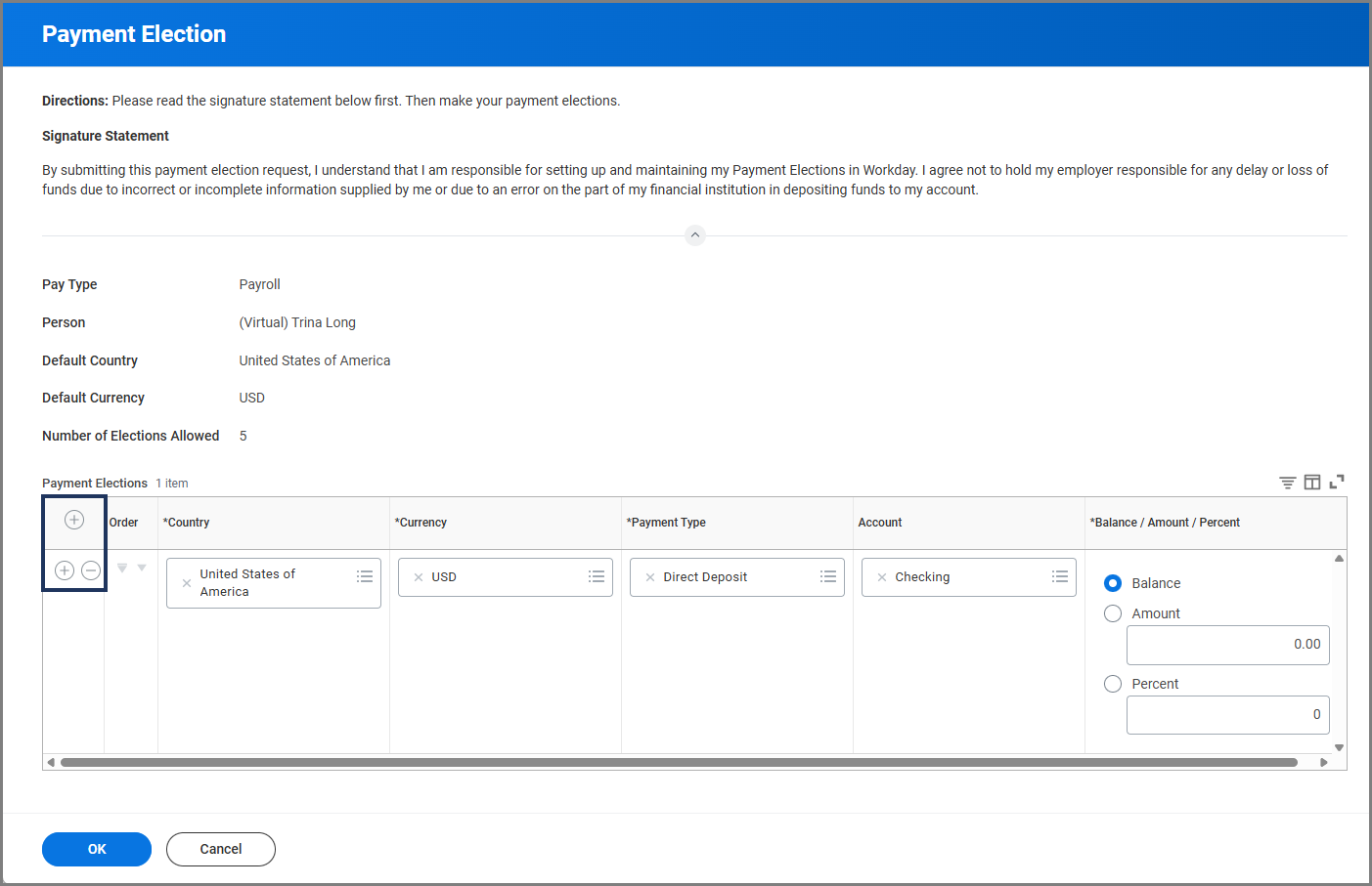 - On the next screen, edit the current Payment Election or add an additional election by selecting the Plus Sign (+) icon. Fill out the following fields as needed: