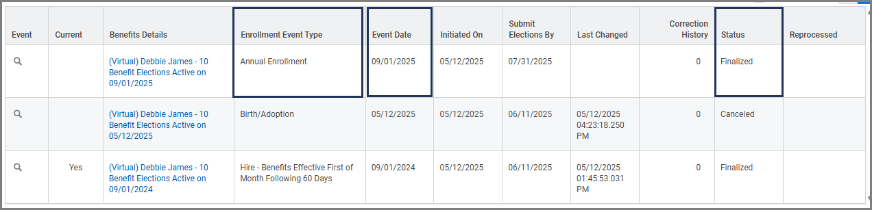 - Find the correct Open Enrollment Change task by using the columns Enrollment Event Type, Event Date, and Status.