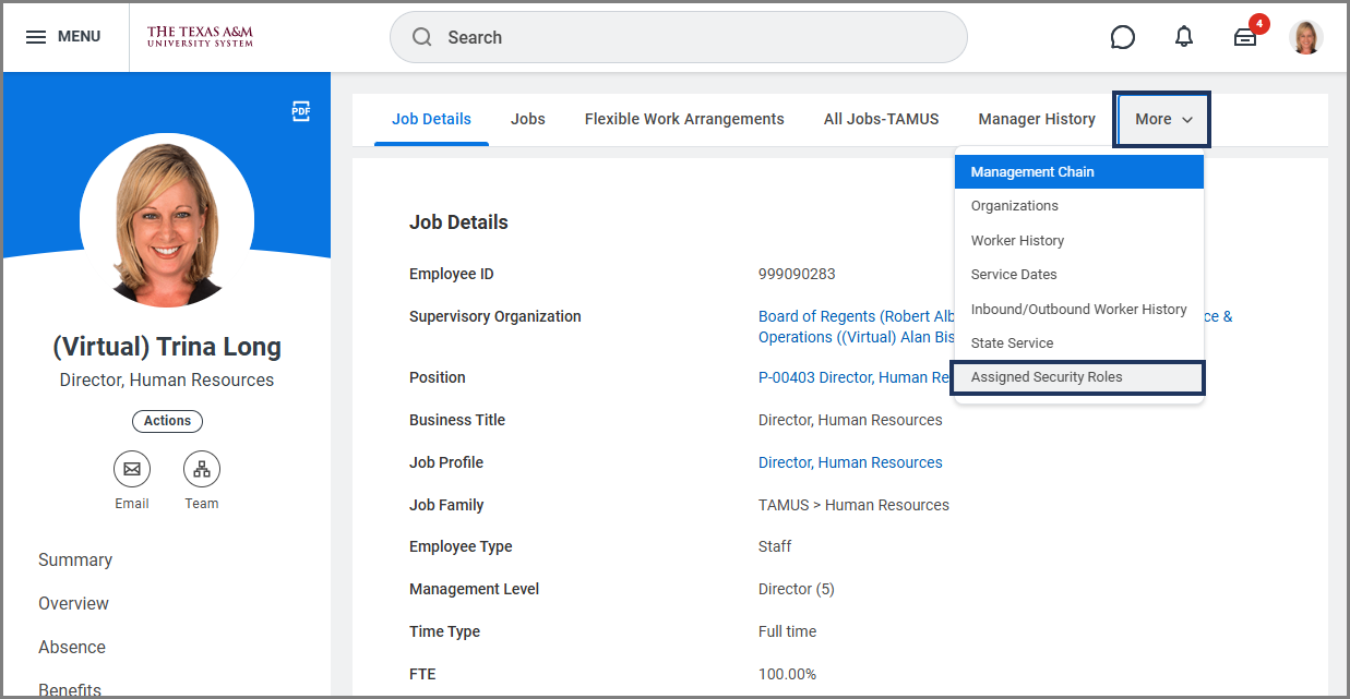 - On the Job page navigation menu at the end, select More then Assigned Security Roles.